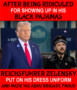 After being ridiculed for showing up in his black pajamas, Reichsfuhrer Zelensky put on his dress uniform. Zelensky became self appointed “National Leader” after his